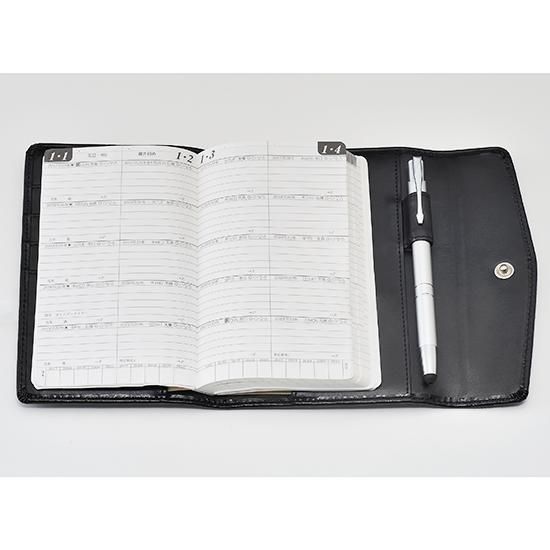 内容…日記ページ(1ページあたり2日×5年分、1月始まり)、新設知っておきたい慶祝行事、贈答のマナー頁、郵便物の料金頁他に世相・抱負を記す「年頭にあたり」ぺージ、5年暦、年間予定表、月間予定表、補足ぺージ、家族の記録ぺージ、贈答品の控えぺージ、パーソナルメモページ、ID・パスワード控え、住所録、日本地図、満年齢表、常用漢字表など、しおり3本付き、ペンホルダー・カードホルダー付専用牛革カバー付属、化粧箱入り