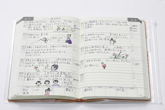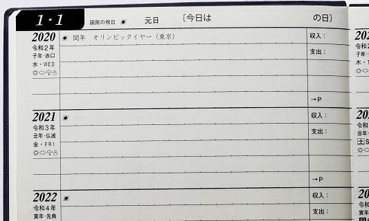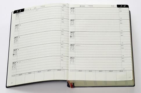 内容…日記ページ(1ページあたり1日×5年分、1月始まり)、地震にあった時の防災マニュアル頁、知っておきたい慶祝行事、贈答のマナー頁他に世相・抱負を記す「年頭にあたり」ページ、5年暦、月間予定表、月次出納集計とクレジットカード利用記録ぺージ、補足ぺージ、満年齢表、日本地図、冠婚葬祭の記録ぺージ、家族の記録ぺージ、パーソナルメモページ、しおり2本付き、化粧箱入り