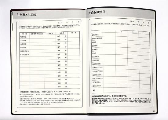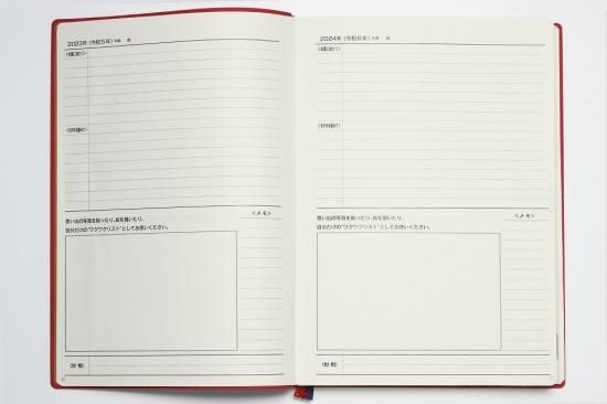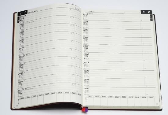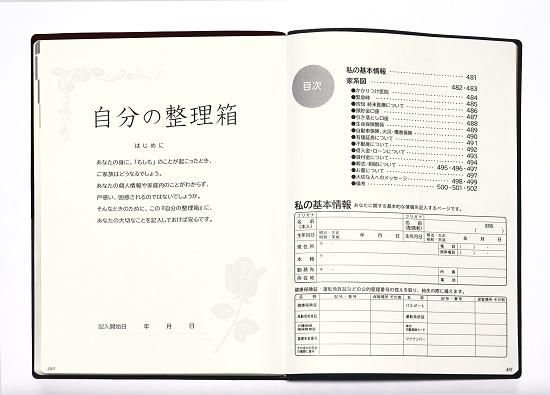 内容…日記ページ(1ページあたり1日×10年分、1月始まり)「自分の整理箱(エンディング・ノート)」、地震にあった時の防災マニュアル頁、知っておきたい慶祝行事、贈答のマナー頁に更に、一般的な葬式の流れ頁、世相・抱負を記す「年頭にあたり」ページにその年の記念写真貼付欄、「各年を顧みて」ページ、10年暦、月間予定表、補足ページ、耐久消費財購入一覧表、家族の記録ぺージ、住所録、満年齢表などしおり2本付き、化粧箱入り