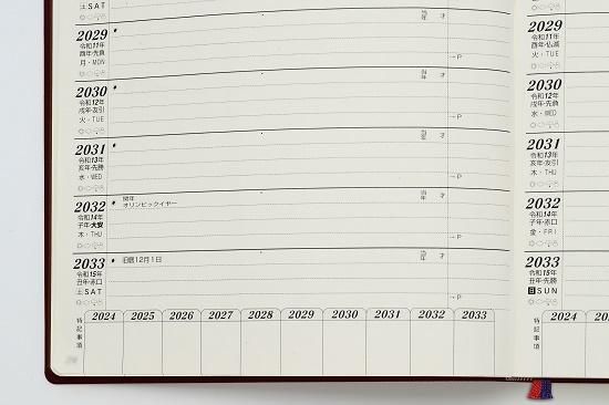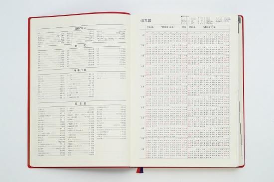 内容…日記ページ(1ページあたり1日×10年分、1月始まり)「自分の整理箱(エンディング・ノート)」、知っておきたい慶祝行事、贈答のマナー頁、世相・抱負を記す「年頭にあたり」ページにその年の記念写真貼付欄、「各年を顧みて」ページ、10年暦、月間予定表、補足ページ、耐久消費財購入一覧表、家族の記録ぺージ、住所録、満年齢表などしおり2本付き、化粧箱入り