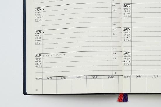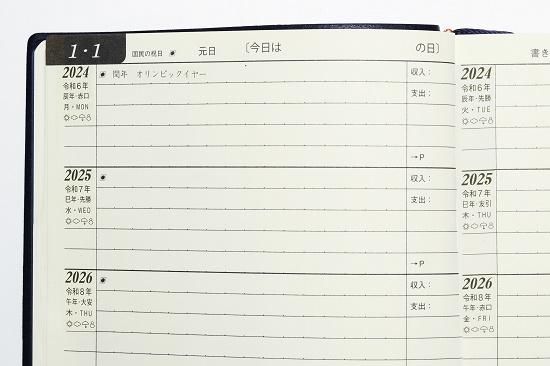 知っておきたい慶祝行事、贈答のマナー頁他に世相・抱負を記す「年頭にあたり」ページ、5年暦、月間予定表、月次出納集計とクレジットカード利用記録ぺージ、補足ぺージ、満年齢表、日本地図、冠婚葬祭の記録ぺージ、家族の記録、パーソナルメモ、しおり2本付き、化粧箱入り