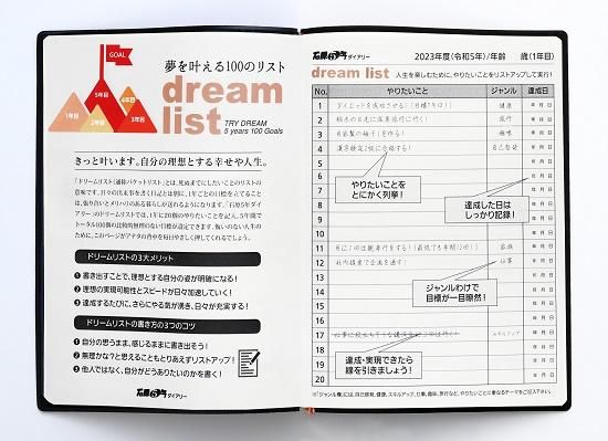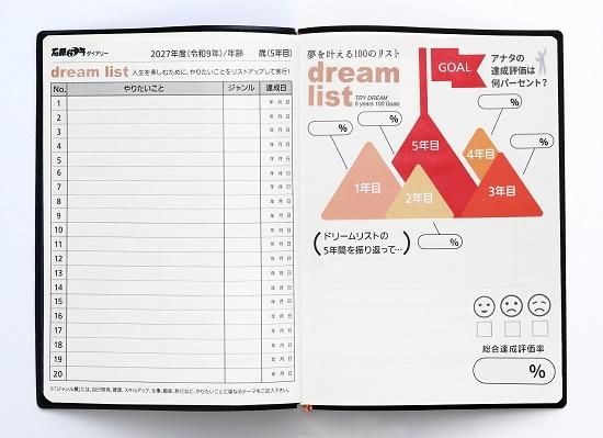 内容…日記ページ(1ページあたり1日×5年分、1月始まり)、”dream list”を新設
