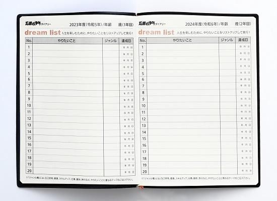 「夢を叶える dream list」を新設しました。1年間で20個、5年で合計100個の叶えたい夢や目標を記載するページになります。また、進捗状況や達成した日も記載できるようにしており、モチベーションアップにもつながる工夫もしています。