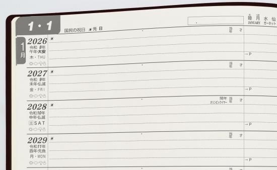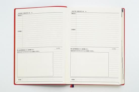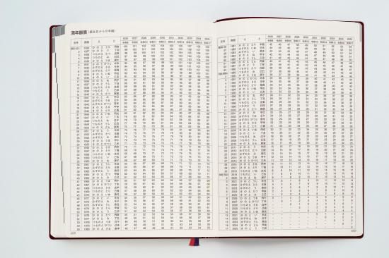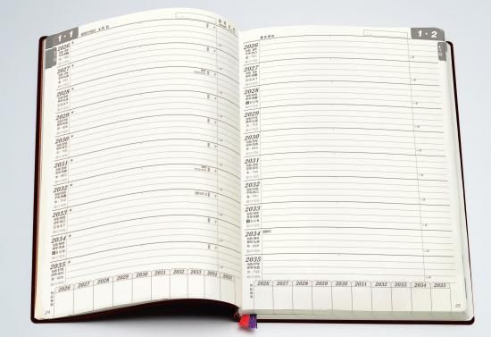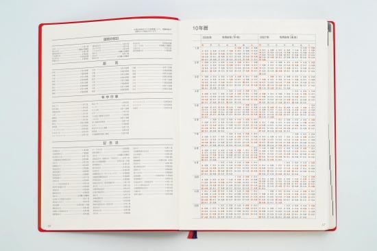 内容…日記ページ(1ページあたり1日×10年分、1月始まり)「自分の整理箱(エンディング・ノート)」、知っておきたい慶祝行事、贈答のマナー頁、世相・抱負を記す「年頭にあたり」ページにその年の記念写真貼付欄、「各年を顧みて」ページ、10年暦、月間予定表、補足ページ、耐久消費財購入一覧表、家族の記録ぺージ、満年齢表などしおり2本付き、化粧箱入り