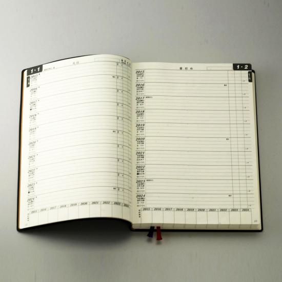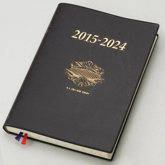 内容…日記ページ(1ページあたり1日×10年分、1月始まり)、経済指標・世相・抱負を記す「年頭にあたり」ページ、「各年を顧みて」ページ、10年暦、月間予定表、補足ページ、耐久消費財購入一覧表、家族の記録ぺージ、贈答品の控えぺージ、住所録、度量衡換算表、日歩・年利換算表、ID・パスワード控え、パーソナルメモ、満年齢表、常用漢字表など、しおり2本付き、化粧箱入り